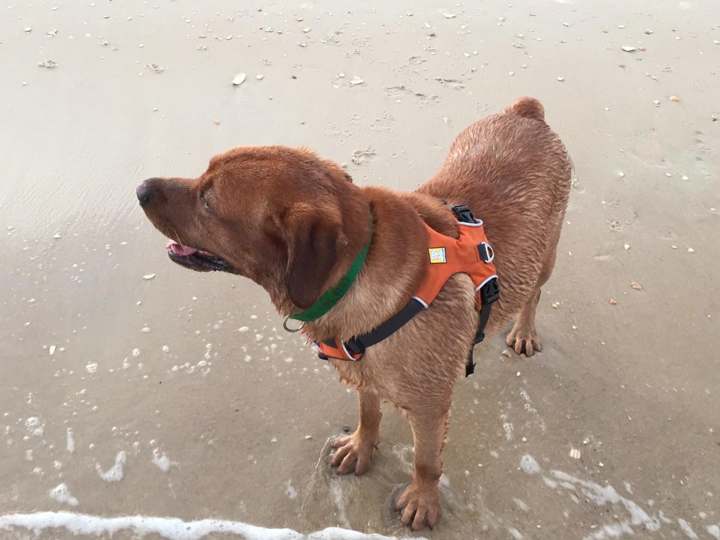 The campground we have had to ourselves for the week has experienced a population explosion. Most of the newly arrived people are fishers, and by the time we are having coffee, are gone for the day. In the evening, the bay across from our site is dotted with people and with fishing gear. At one of the campsites in the back today a huge pile of scallop shells appeared, which Ryder found quite interesting. Someone will be having quite a dinner tonight. Last night we went to an oyster joint called Lynn’s (yes we did meet Lynn). To get to the back deck you have to walk through the processing area, and a guy had just dropped off his catch, a huge box of beautiful silvery red fish.