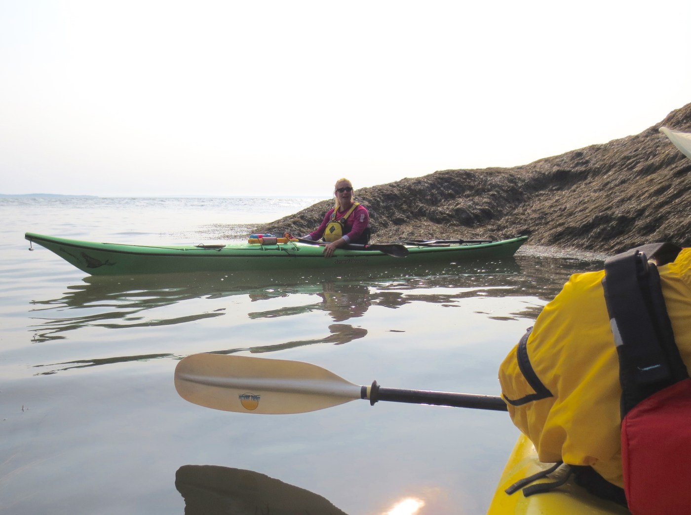 The coastline in this part of the Fundy bay is heavily treed and the view changes with the tide. Eagles perch on branches, and there are rocky stopping points called “beaches,” but there is very little that is beachy about them. The rocks are carved out by the wind and water. This part of the coast is not as dramatic as popular tourist locations like Hopewell Rocks, but it benefits by appearing as god and wind and water made it. We stop after about an hour and a half of paddling for a snack, where I try the dulse, a seaweed snack. We we are told “everyone eats dulse and whatnot.” It’s a little like a chewy version of nori. Amanda gives us a lesson in how the tide works by using rocks as a solar system to illustrate the pull of the sun and moon, and draws a map of the Fundy Bay in the sand to explain the hydraulics of the area. I predict her future students will be head over heels in love with her.