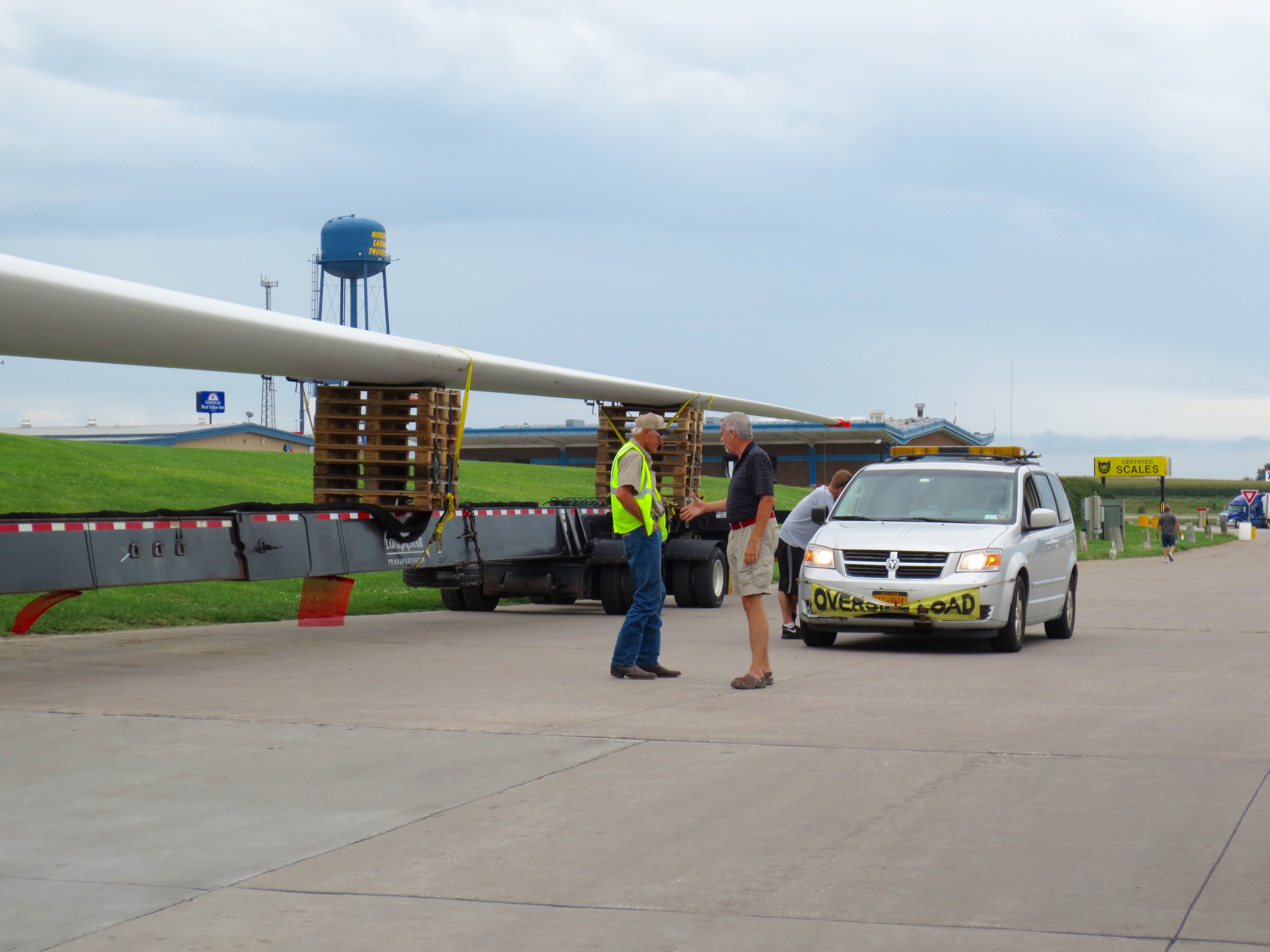 There were three trucks carrying windmill blades out of Van Wert OH to Wyoming. Each blade is 190 feet long.  With the trucks and all the escort cars, here were 19 vehicles in the convoy. Ben pulled the RV in front for comparison.
