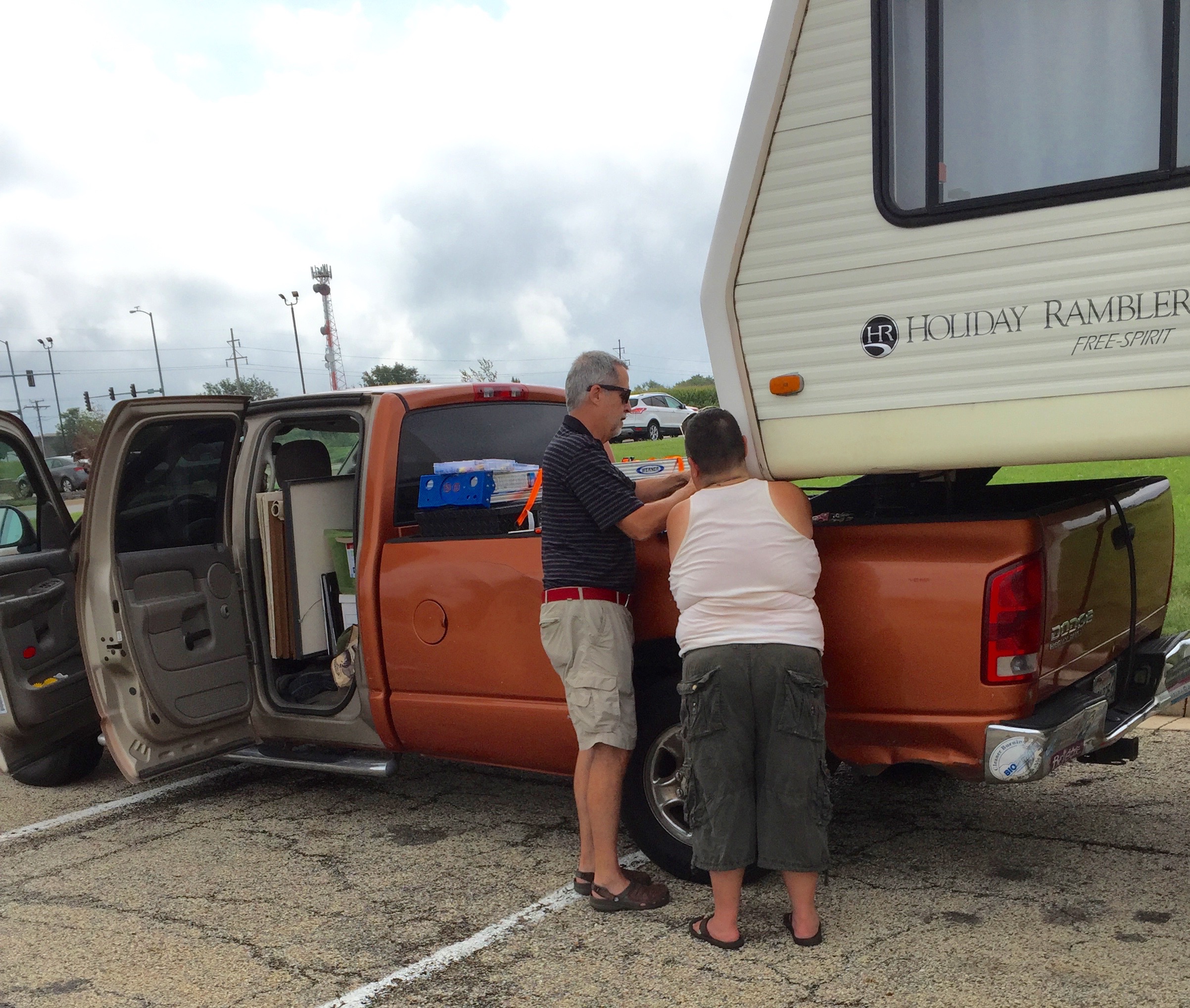 After our harrowing drive to Peoria, we pulled into Wal-Mart and parked behind a well-traveled Holiday Rambler fifth-wheel. The next morning we were puttering around and passed our fellow traveler in the store. We were getting ready to leave when Ben noticed she was working on her rig, so he stopped over to see what was going on. He came back for his toolbox, and a couple minutes later I joined them. They were repairing the emergency braking system on the trailer.