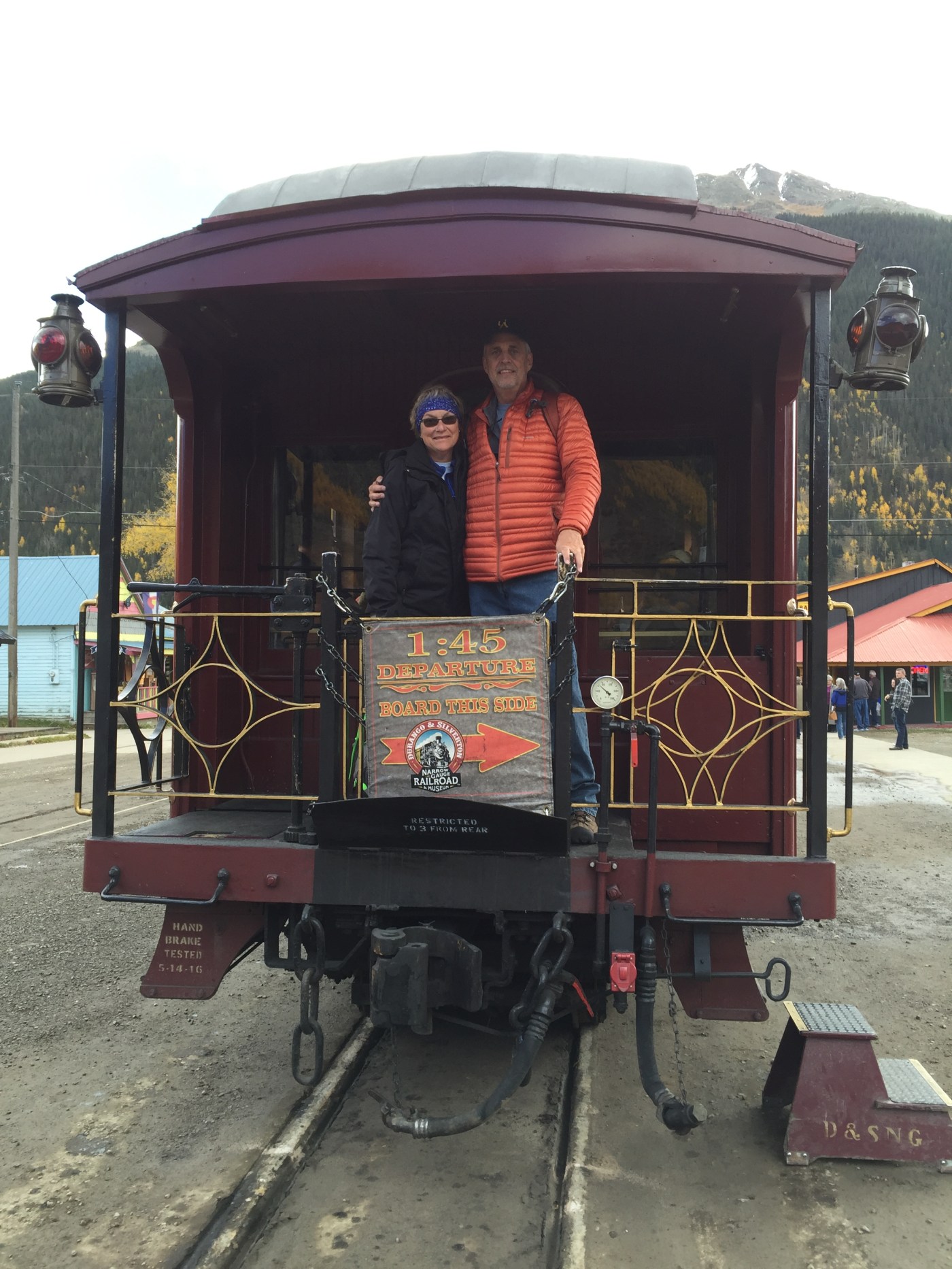 We arrived in Durango after weeks in Utah which is beautiful, hot dry and rocky. By contrast, this part of Colorado was green and lush with a hint of fall in the air. Aspen trees had already turned golden. The city of Durango is oh so cute, on the order of Santa Fe, Yellow Springs or Boulder. It’s packed with shops filled with cowboy and Indian stuff, lots of Reiki practitioners, holistic food and healing shops and restaurants, lots of which are ersatz “olde west saloons.” Since it’s Colorado, I do have to remark that there were also many health stores with green cross emblems displayed proudly. In case you’ve been living under a rock and don’t know this, marijauna is now mostly legal in Colorado. The sign of the green cross is the stoner equivalent of Golden Arches. The names of the pot stores are—well, quaint as if some hippie addicted to Roadrunner cartoons was hired to come up with them. “Acme Health,” “Acme Care,” “Teluride Bud Company,” and “Quality Health,” were some I noticed. I did not research all the legalities, but apparently like grandmas sherry, pot is to be used “for medicinal purposes only.” I should put in a disclaimer here; though we saw many pot stores, we did not shop in any pot stores. I hate to disappoint any of you hoping for more than a train story, but the time for such shenanigans has long passed for us.