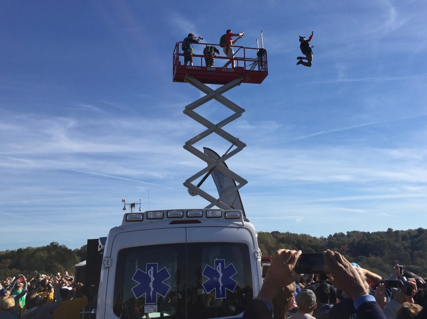 To be allowed to BASE jump on the New River Bridge, prospective jumpers are required to have done at least 100 parachute jumps. A BASE jumper’s major obstacle is altitude. A skydiver opens her chute at around 2,000 feet, and they can open their parachutes in a way that reduces the jerk of the lines. They also have a back-up chute if the main one fails. BASE jumpers start out well below 2,000 feet. In the case of the New River Bridge, it is 876 feet. That is not a lot of fall time—less than 5 seconds of free fall before impact. Most BASE jumpers don’t pack a back up chute. To open their chutes, they deploy a pilot (smaller) chute by throwing it out at just the right moment. Steering is a big deal for the BASE jumpers. When you are looking at the pictures, note how tiny the target area is, and how much other stuff there is to hit—trees, rocks, water, train tracks and the like. Being able to steer away from an object makes the difference between living to jump again and—splat. Jumpers are all ages. At one point the announcer said the oldest jumper was 83. A guy in a wheelchair jumps every year, wheelchair and all. If you are interested enough to jump but lack training and have a very full wallet, you can strap yourself to another jumper and take the leap.