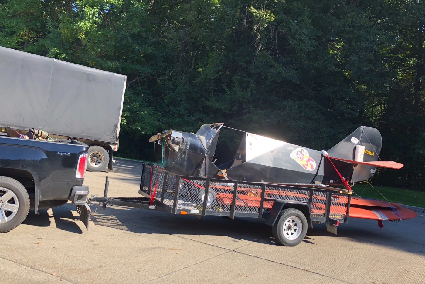 my attention. The truck was carrying an old engine in its bed and the trailer was piled full with some kind of—well, pieces of stuff that might be a vehicle. At first I thought it might be a scrapped amusement ride car. When I looked closer, it looked like it was an airplane built by someone who had a death wish. It had a tiny single propellor and was banged up, so I figured I had guessed right about the death wish thing. I waited for the driver to come back to find out what the heck it was. Two men approached the truck and I walked over to talk to them. The first thing I asked them was “Is this a real plane and is it really capable of flying?” That’s how I met Tom and Jim, from Guleph Ontario. They were taking this pile of metal and canvas they got in Idaho back to the Tiger Boys Aircraft Works & Museum.