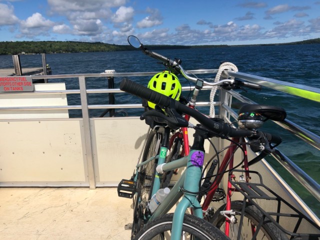 We rolled back into William’s Landing and joined about 15 other people who were waiting for the ferry. It was the penultimate ferry of the day, so we’d arrived with plenty of time to spare. There were lots of people with bikes waiting to cross over, so many I didn’t think there would be enough room on the boat for all the bikes. Naturally this was not Patrick’s first rodeo, and he carefully stacked and lined up all the bikes to fit in their allotted space.
