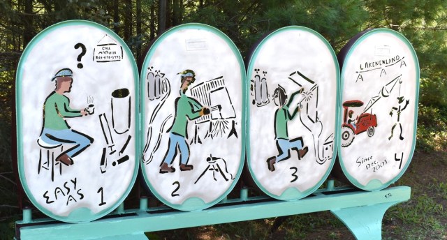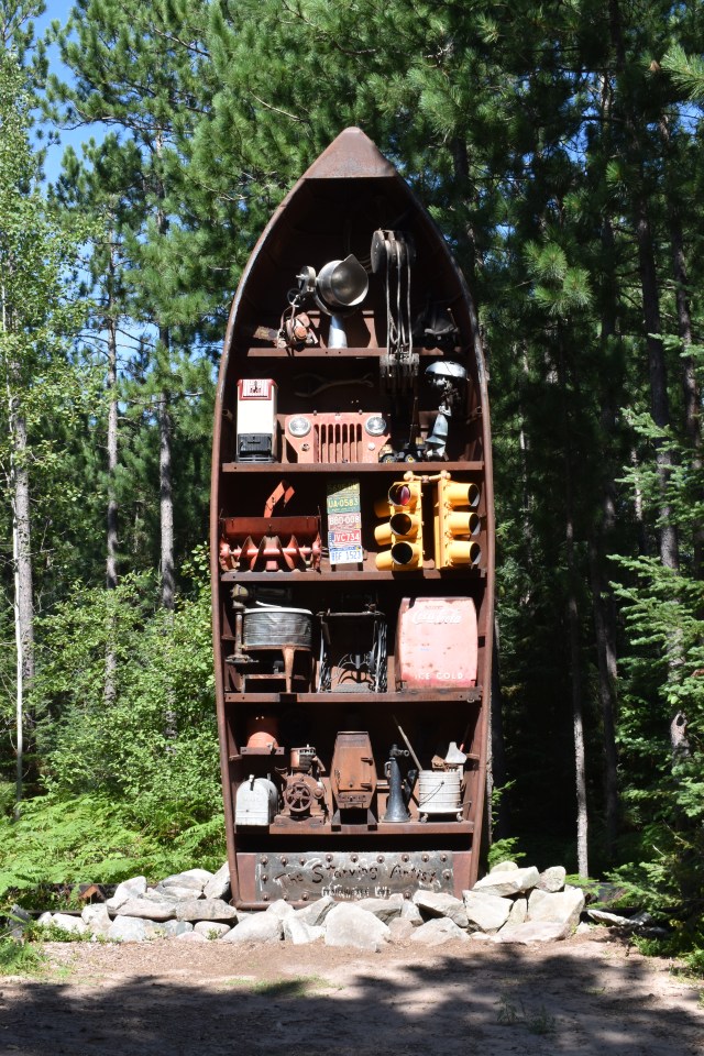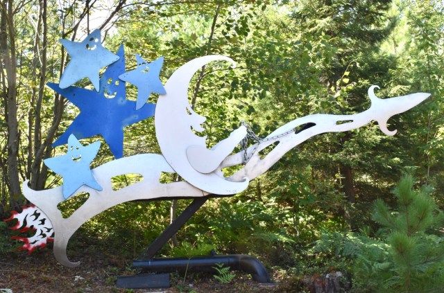 Michiganders, especially those in the UP have a sense of humor and like to mess with the tourists from time to time. On the way to Lakenenland we spotted a sign that said “Lakenenland Junk Yard Art” and made an abrupt turn (the kind of maneuver I call “Bat Turns”) that caused much consternation with the motorists behind us. Once our blood pressure returned to normal, we realized we were punked into a junkyard lot. A little further down the road we arrived at the real deal. Lakenenland is a one-man art installation of metal sculpture born from the whimsical mind of welder Tom Lakenen. In an interview he said he started making the sculptures in his yard “about 20 years ago for something to do after I quit drinking.” His first sculpture was a group of dancing wolves made in his front yard. “No one threw eggs at it, so I built another one.” Eventually there were 20 sculptures in his front yard and the Township cited him for improper signage. To compromise he moved the sculptures to his back yard. The township continued to lodge various zoning complaints over the years. Tired of the frustrations, Tom investigated some old logging property and purchased what is now Lakenenland in 2003. Unfortunately legal scuffles about the park, its zoning and signage continued for years until he was rescued by a group of snowmobilers sympathetic to his cause. One of the snowmobilers happened to be a lawyer. The lawyer managed to finagle a legal technicality with the deed on the property to eliminate the zoning requirements, and Lakenenland grew into its present state. Tom tells this story himself in a Story Corps recording from the Northern Michigan University WNMU-FM website.