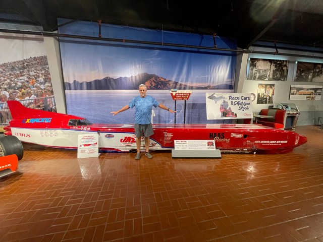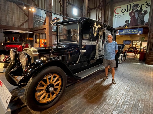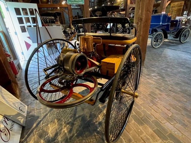We arrived in Kalamazoo and the next morning we headed out to the Gilmore Car Museum. It’s situated north of Kalamazoo on 90 acres of farmland in Hickory Corners. You drive up to the main building which is styled like a turn-of-the-century factory. For your admission fee you get access to 400 vehicles and 190,000 feet of exhibit space. The collection is set up to follow the development of the American automotive industry and how we went from an agrarian-horse-and-buggy bunch to the car-crazed country we became. Ben asked about his grandfather’s truck, then we were told it had been taken off the exhibit floor for repairs. Still, we had 400 other cars to look at, so we headed into the exhibits.