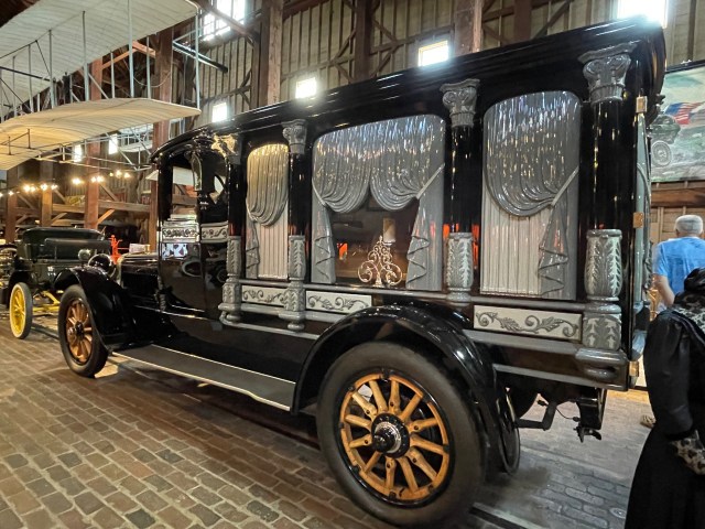 In the earliest years automobiles were small and typically crafted from the same materials as were buckboards and buggies—wood, iron leather and steel. Before chrome plating technology, brass was the go-to metal for cars, hence the exhibit title “Brass Era Cars.” Some of them had so much brass they looked like circus floats; and a common characteristic of Brass Era cars is they were mostly enormous. My favorite vehicle was a hearse (those of you who know me well aren’t surprised). The chassis was built in 1916 by the Winton Car Company in Cleveland Ohio, and the body was done by Crane & Breed in Cincinnati. Crane & Breed made all kinds of funerary items, from plumes and hats to caskets. Abraham Lincoln was buried in a Crane & Breed metal casket. They were the prime hearse makers of the time. In keeping with the solemnity of its use, there is no shiny brass on this Brass Era car. It is all black and gray, gleaming painted steel and carved wood finishings. The thing is HUGE. An advertisement in a local newspaper features lines from poet F.F. Woodall: “I am the Hearse – Death’s taxicab; the carriage of the dead! None ride with me but once. Thereafter upon earth – Their riding days are over.” That’s a slogan totally unfit for our squeamish times.