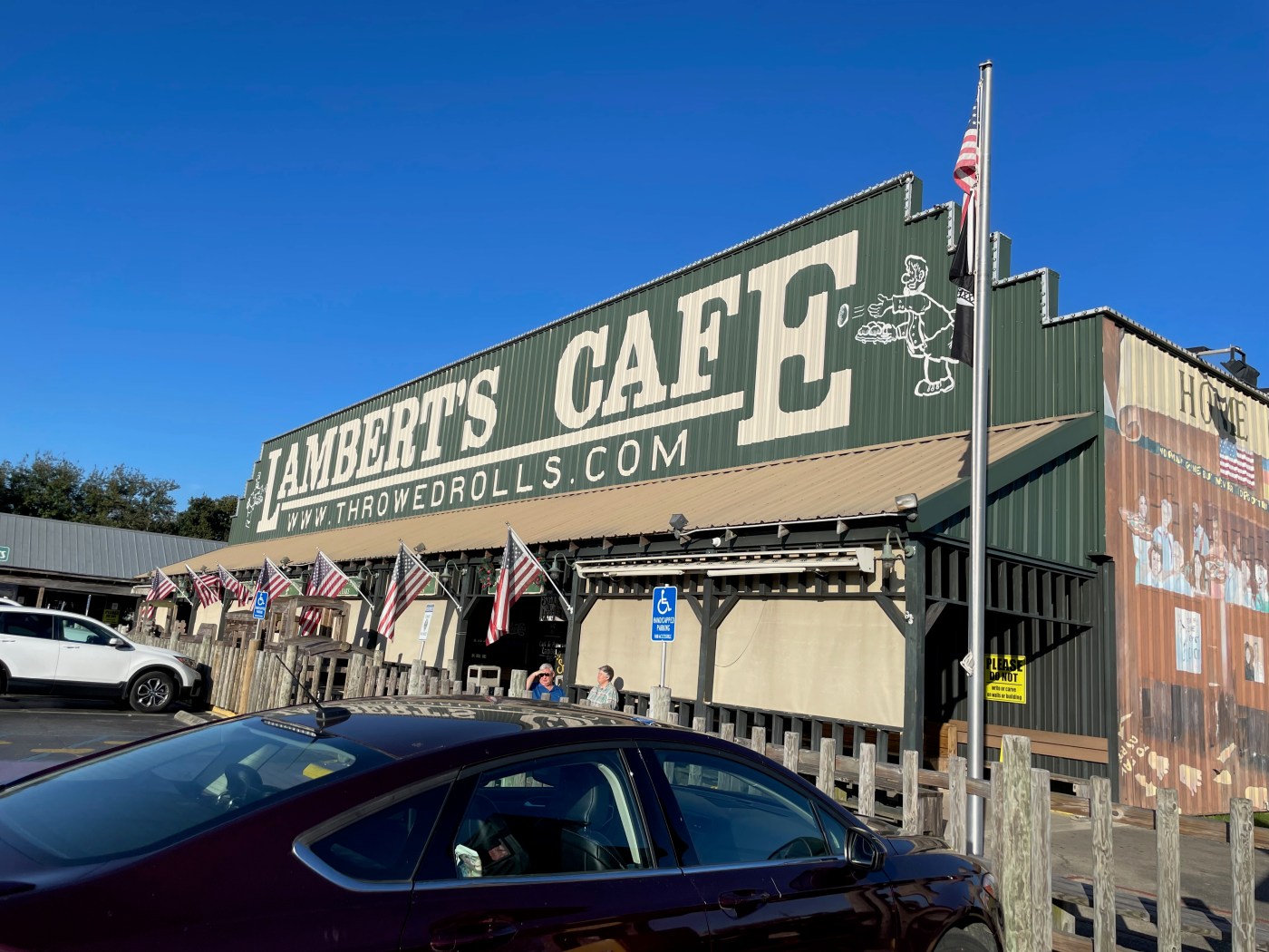 We spent a week in Gulf Shores AL at the stunningly beautiful state park. On the way down, Ben told me we were going to make time to go to nearby Foley to visit Lambert’s. When I asked him what Lambert’s was, his answer was mystifying. “It’s the place where they throw rolls at you.” I asked him to explain.