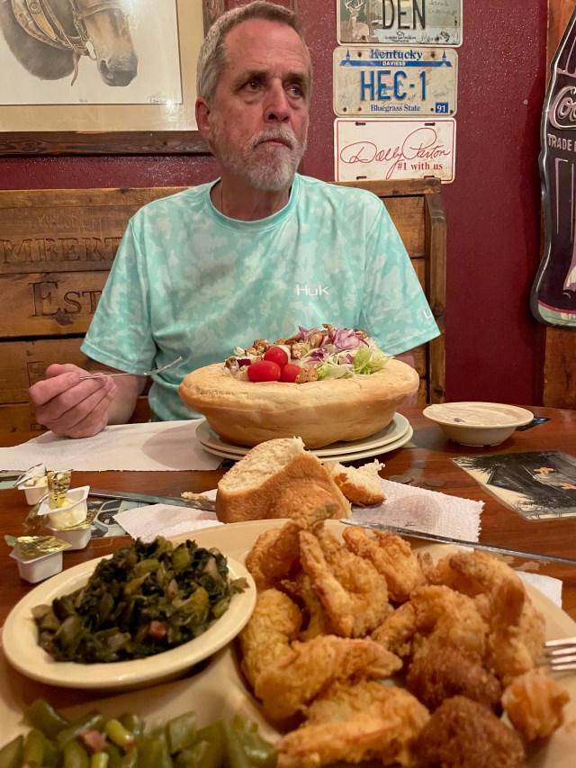 We were led to our table and handed an intimidating menu. (see below) Once seated, drink orders taken, a parade started. First to come by was a guy with an enormous tray of equally enormous rolls. Since he was right at our table he didn’t exactly throw a roll at us; it was more of a gentle underhanded lob. A young woman came by to offer us a choice of sorghum (molasses for you northerners) or apple butter for our rolls. I passed, but Ben loves apple butter. I’d guess she plopped about half a cup of the stuff on his roll. After that, a steady stream of servers stopped at our table with what Lambert’s calls “pass arounds.” It’s quite a list, including; Apple Butter, Sorghum, fried okra, tomatoes and macaroni, macaroni and cheese, black-eyed peas and boiled cabbage. These are plopped at your table for no extra charge before, during and after your meal. We had rolls and I had okra, though I had to stop the Okra Girl from giving me a pile of the stuff. We spent the rest of our time at Lambert’s saying “no thanks” to the orbiting servers. Ben remarked that diners should have a sign to put on the table–something like ‘no solicitors.’ When the first wave of pass-arounds subsided our server came back and took our order. There wasn’t much of a wait until our enormous platters arrived. We’re both light eaters and as such we were definitely in the minority in the restaurant. Everyone else was there to EAT. It was fun. Several generations were crammed around the big tables eating and laughing. I doubt a family could whomp up such a varied menu for 12 people at home without going broke. Before our bill came, the pass-around servers made one last revolution. I guess they don’t think they did their duty unless their guests were face down in a food coma. After our meal we checked out the gift shop to look around, but didn’t buy anything. Ben found the apple butter tempting but the jars were Lambert’s sized.