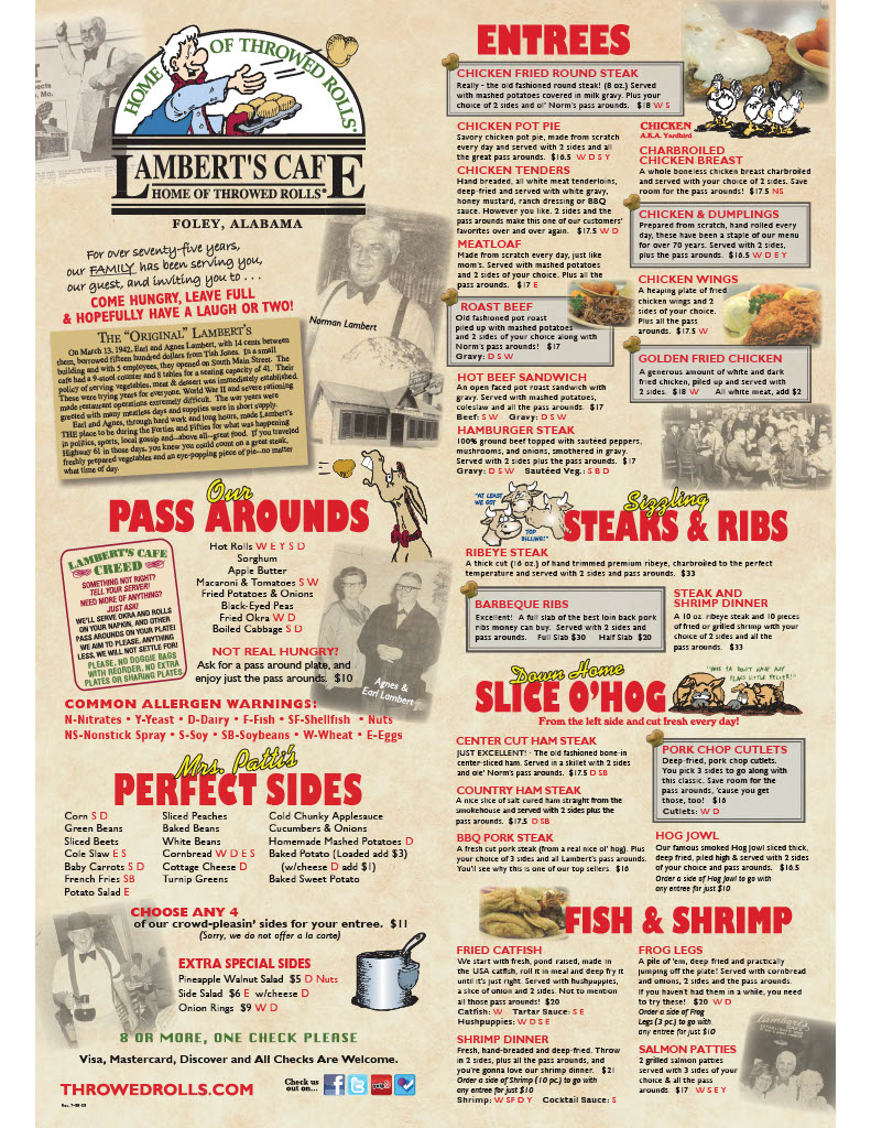 More about ‘fixin’s’ later. There are three Lambert’s locations: two in Missouri, the first Cafe in Sikeston and a second in Ozark. The third location is in Foley, Alabama. I read that Earl and Agnes Lambert liked to vacation in Alabama at Gulf Shores. Since they liked the area around Foley, they decided to build a restaurant near their vacation spot. It was smart of them to expand only into markets the family knew would be sustainable. Don’t look for franchises any time soon. If you want the experience you’ll have to point yourself south.