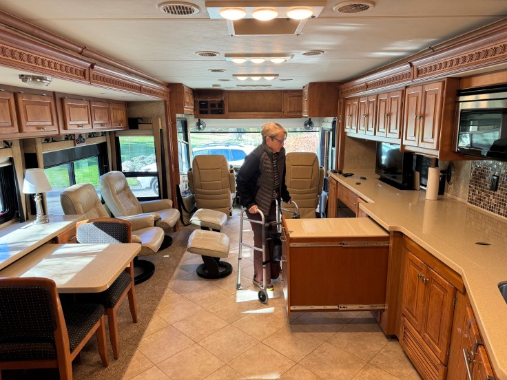 When it began to look like we were going to be allowed to travel, we started readying the RV. The lead up to this departure was grueling. We started packing a month before I was due to get my leg because we were starting from scratch with this “new” RV. Some years ago I wrote about loading up our first RV. At that time I thought it was a lot of work, but it’s even more work for a one-legged senior citizen. First came cleaning—any time you move into a new place you clean, because living in other people’s crud—ew. Ben’s sister Julie pitched in to help. Lacking a leg and because of all the aforementioned reasons a walker or a wheelchair wouldn’t work, I used my trusty “wheelie saddle” to get around in the motorhome. Both Ben and Julie told me it wasn’t safe, and guess what? I ignored them. Everything went well until the end of the day. I leaned over just a little too much and the wheels kicked out from under me. I instinctively extended my nonexistent left leg to catch myself. Whammo, I landed right on the knee of my amputated leg, hard. This met all my criteria for a fall. I bashed it pretty hard, but an ice pack and a pain pill hoarded from one of my previous surgeries took care of that. I half expected my knee to turn black and blue, but thankfully it didn’t. A couple days after my tumble in the RV Ben took me to my regular checkup, and the PA asked the dreaded question—“Have you had any recent falls?” I looked at Ben with that intimate eye gaze every spouse has to communicate “keep your trap shut,” then I looked her straight in the eyes and said “nope.” I said the same thing when the OT, PT and Home Health Nurse came for their visits. “Any falls?” Nope, nope and nope. I think Ben was a little alarmed at how effortlessly I lied. So, sue me, add lying to my ever growing list of faults. The only way they’re gonna know is if they read this blog. So there. That was my one and only fall off the wheelie saddle (so far) which was a miracle.
