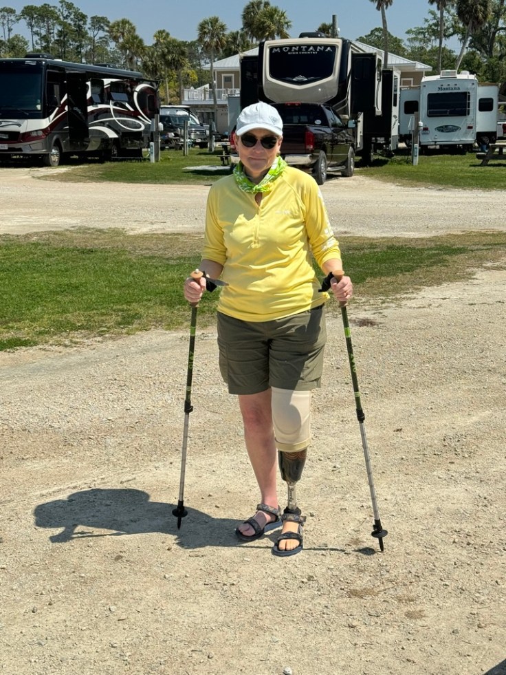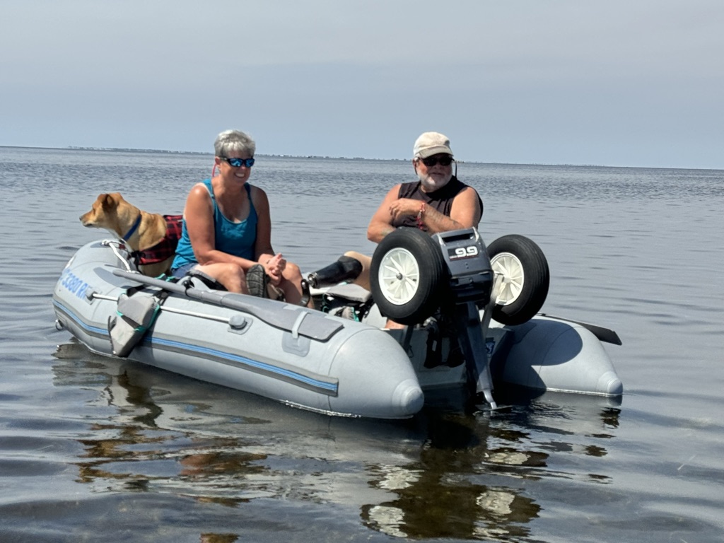It was awkward at first. I fumbled around with my paddle, tried to adjust myself in the boat and took a few paddle strokes to get turned around. The whoosh, whoosh of the blades sweeping in the water had an instant effect on my body. My muscle memory kicked in and as I came up to full cadence, I felt strong and capable for the first time since the accident. I got a little weepy from the sensation. We planned a short paddle since it was my first time out. Friends Sonny and Linda trailed us in their little powerboat. After an hour of paddling I was tired but also reluctant to head for shore where I’d have to resume my struggle getting around on dry land. I now have great sympathy for whales, dolphins, fish, octopi and mermaids. The first rule of any out and back trip is that you turn back before you get tired so you have enough oomph to return safely, so I turned back. Back at shore, our friends surrounded us and helped me get out of my boat—which is to say they hauled me up like a sack of potatoes. I opened my trekking poles and wobbled back to the RV, while friends helped Ben schlep our stuff. We went for celebratory cocktails afterward.