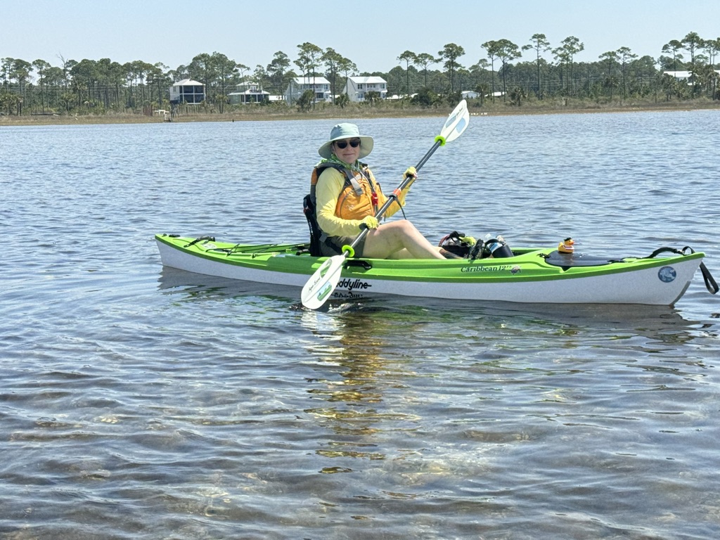 On the morning of the paddle our friends helped Ben get our boats to water’s edge while I got busy getting myself across the short distance between the campground and the water. I’ve used trekking poles for hiking ever since my hip surgery, but now I needed them more than ever. I. Was. So. Agonizingly. Slow. Left step…pole. Right step…pole. Then I had to get over the strand line, which is comprised of sea grass, shells, driftwood and whatnot the high tide left at the top of the beach. It’s usually damp and squishy. As I staggered through the strand line, I had lots of support. My good friends cheered me on by advising me not to fall, and that I had plenty of time to get to the boat before the sun set in 5 hours—ha. Somehow I managed to make it into the boat—actually more of a controlled fall backwards. A couple helpful nudges and my kayak drifted out, free.