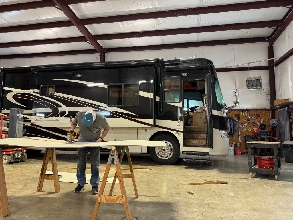 A big white truck, a building filled with sawdust and a lot strewn with pieces and parts of RV cabinetry meant we were at Chris Berry’s wood shop.