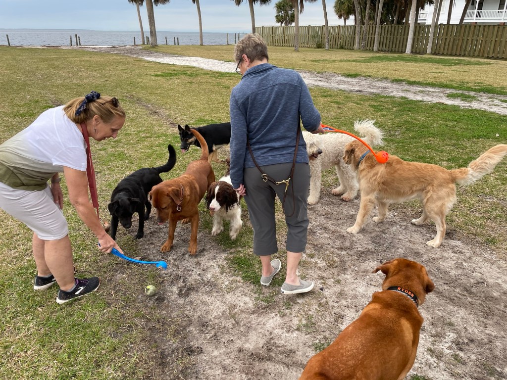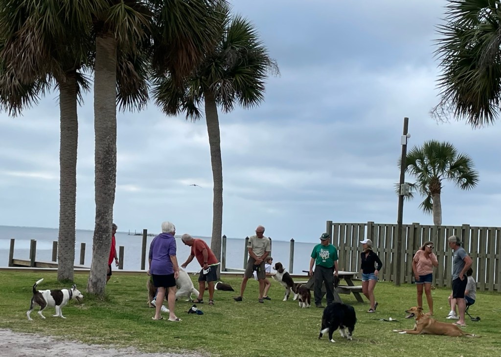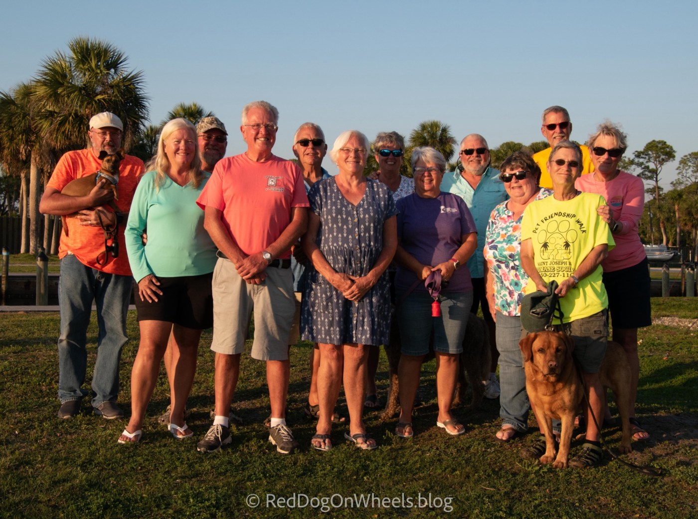 The area including Port St. Joe and Presnell’s RV park took a direct hit from Hurricane Michael in 2018. A house across the canal on a lot owned by the RV park was destroyed by the storm. We all took a bye on 2020 thanks to the pandemic, but returned in 2021. The lot remained vacant, but the debris had been cleared out. One morning I noticed a woman exercising her pup in the empty lot; I walked over with my dog (Gumbo) and they ran together while she and I talked. Renee told me that she brought her dog Breezy over every day to let her run. I let some of our neighbors know, and before long the vacant lot across the canal became an unofficial dog park. Over time, the group grew and by the end of our months there, a 4:00 PM “Doggie Happy Hour” became a regular event. Our dogs knew the schedule. They’d start pestering us at 3:30, and whine if we were tardy in bringing them over. The group expanded and contracted depending on travel schedules, but over the years a core group formed out of those of us who where there on the same schedule. We started hanging out for our own happy hour fun. When it was time to turn north, we compared schedules to make sure our stays would align. “See you same time, next year,” we said.