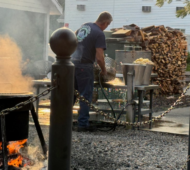 Door County’s prime form of show-stopping entertainment is the fish boil. It shares a similarity with other mass forms of cooking such as the clam bake, crawfish boil, and New England boiled dinner in that they are methods for feeding a huge crowd all at once. These meals all have their roots in feeding work crews; humble, common ingredients that can be cooked together quickly. I read that Scandinavians brought the fish boil to Wisconsin, cooking up vats of fish and starchy food to feed lumberjacks and fishermen.