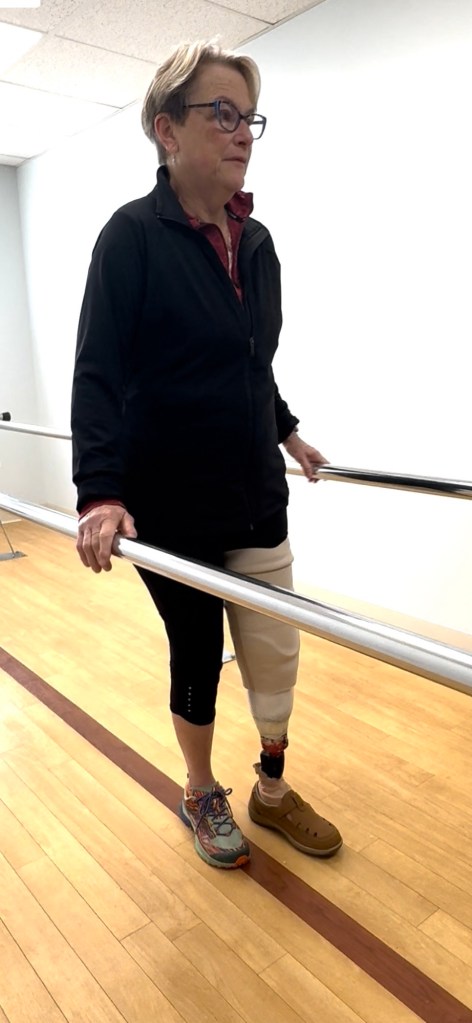 I went to therapy twice a week to learn to walk, balance, sit and stand with my new leg. Each time I stood up, I’d experience that familiar stab of pain. Like most people, I thought leg amputees bore their weight on the bottom of their limb. The socket is designed so that your weight is supported by the bones of your knee–something our knees are not designed to do. The only thing to do is to get used to the feeling. One time I asked Brian if I’d ever not experience pain on standing. He was non committal–my particular kind of pain was related to nerve damage from the accident “it depends,” he said, “most people get used to it.”